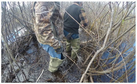 At present, the trapping of beaver is infrequent in the western James Bay area, leading to an increased population of beavers in this region [14]. This has been a contributing factor to the environmental concerns of local flooding. Over the last two decades, annual flooding on a regional basis has been raised as a major concern and continues to be a reoccurring problem [14,15,16]. Overall, environmental change and a decline in subsistence practices, which were a source of beaver management, contribute to the flooding [14]. Increased temperatures and excessive rainfall in the spring have caused quicker snow melts, resulting in larger amounts of water flowing down the river and causing flooding [14,15,16]. These flooding events have also been attributed to the overpopulation of beavers and to beaver dams [14].