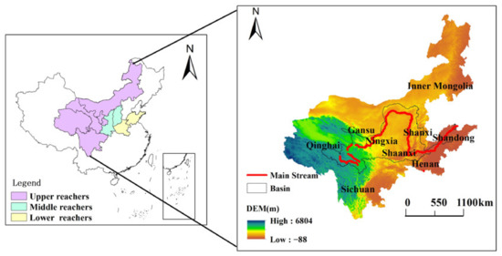 Locations of the upper, middle, and lower reaches of the Yellow River Basin (source: Authors’ own calculation/conception, using ArcGIS 10.7 software (Environmental Systems Research Institute, Inc., Taiyuan, China)).