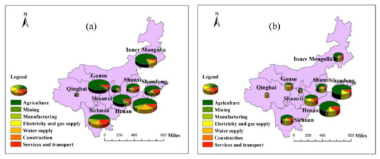 However, the high water stress index in Gansu indicates that there is extreme water scarcity in the area. Continuing to export a large number of water-intensive products will make water resources in Gansu even more scarce. In addition to the agricultural sector, the virtual water input sector in Qinghai Province is mainly concentrated on the electric power, water supply, and service and transportation industries. The total proportion of virtual water input in these 3 sectors is 48.65%, which is slightly higher than that in the agricultural sector. Nonetheless, the GDP of Qinghai Province is not high, demonstrating that these sectors have an insufficient utilization of virtual water. In the middle reaches, the province with the largest input of virtual water in the manufacturing industry is Shanxi Province, but its sectoral virtual water output is less than the input, showing that Shanxi Province has not effectively utilized virtual water input to develop the manufacturing industry. Simultaneously, the virtual water output of the service and transportation industries in Shanxi Province account for a large proportion, which can continue to develop. Shaanxi’s agricultural virtual water output also accounts for a large proportion, second only to Gansu Province. However, Shaanxi Province has less rain and more sunshine, poor vegetation distribution, and a poor agricultural development environment.