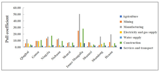 The pull coefficient is used to further analyze the contribution of the virtual water of various sectors in the Yellow River region to the virtual water of the whole sector, and subsequently evaluate the degree of connection between various sectors of the Yellow River region’s virtual water. The pull coefficient of each industrial sector in every province (region) of the Yellow River Basin is calculated through Formula (14) (Figure 5). As can be seen, the agriculture and water supply sectors have the lowest pull coefficients among all of the provinces (regions) in the Yellow River Basin, with values lower than 1.5, indicating that the economic relationship between these sectors and other sectors is not close. The average pull coefficients of the manufacturing, mining, and construction sectors is obviously greater than that of other sectors, demonstrating that these three sectors have strong economic ties with other sectors, and the increase of unit output in these sectors will require a great deal of virtual water. From the perspective of regional differences, the pull coefficient of the same sector in different provinces (regions) is also quite different. The pull coefficient of the mining, manufacturing, and construction sectors in Inner Mongolia is the largest in the whole Yellow River Basin, which is related to the coal-rich areas of Inner Mongolia. In the future, it will be necessary to speed up the transformation of Inner Mongolia’s resource-based economy, develop a green mining industry, and pay attention to ecological and environmental protection. To alleviate the water shortage in this region, policymakers ought to enhance the water efficiency of the mining industry and strengthen the virtual water input of the manufacturing and construction industries. The pull coefficient of the manufacturing industry in Sichuan, Shandong and Henan Provinces is also large because these provinces mainly rely on the manufacturing industry to drive the rapid growth of the GDP. At the same time, these provinces are virtual water export areas of the manufacturing industry, thus the high value-added manufacturing industry should be developed. The pull coefficient of the manufacturing industry in Ningxia and Qinghai Provinces is also relatively large, but their GDPs lag far behind that of Shandong and Henan Provinces, indicating that a large number of water resources are wasted in the manufacturing sectors in the Ningxia Region and Qinghai Province. Therefore, the differences in the pull coefficients of all the sectors in the same province (region) can be explained by the difference in the number of employees in those sectors in terms of raw material input and production technology level. When a sector operates in two different provinces (regions), its pull coefficient differs due to the differences in water-use efficiency between the local and intermediate rivers.