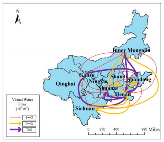 3.3. Virtual Flow Pattern in the Yellow River Basin