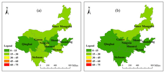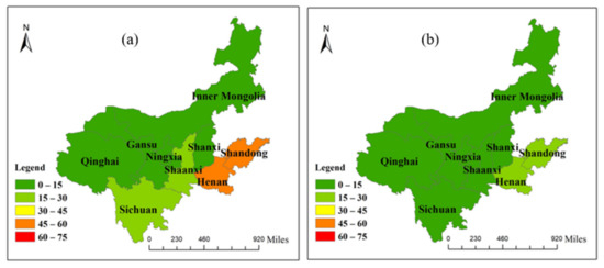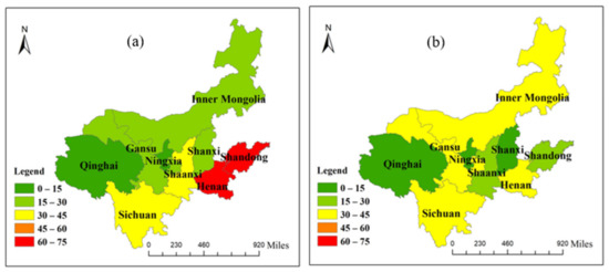 Virtual water trade of each province in the Yellow River Basin: (a) the total outflow of virtual water; (b) the total inflow of virtual water.