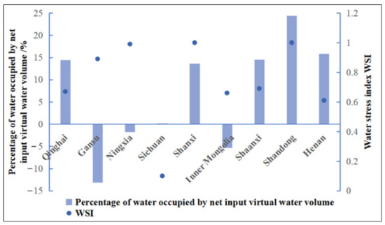 According to Formula (13), it is possible to calculate the water stress index of each province (region) in this area. Except for Sichuan Province, which has a of WSI = 0.1, which belongs to a region rich in water resources, the WSI of the other 8 provinces (regions) in this region are between 0.6–1, which corresponds to regions that are seriously short of water (Figure 10). Specifically, the WSI of Shandong and Shanxi Provinces are the maximum value of 1, showing that the water shortage is serious, and a large amount of virtual water must be input to alleviate the local water pressures, among which the net input of virtual water in Shandong Province accounts for the largest proportion, and the external dependence of virtual water is about 1/4. The WSI of Gansu and Ningxia Provinces are close to 1, indicating that water resources are not abundant, but they output virtual water. The serious disharmony between WSI and the virtual water trade will aggravate the shortage of local water and further worsen the ecology. In regions with severe water stress, the lowest WSI value is the 0.61 of Henan Province, but the net input of virtual water is second only to Shandong Province, meaning that water resources are not fully utilized, and a large number of water resources are wasted. There is little difference in the WSI of Inner Mongolia and Shaanxi Province. However, Shaanxi Province is a virtual water net inflow area, which can alleviate the pressure of insufficient local water resources. In the meanwhile, the Inner Mongolian region should speed up its trade links with other regions to alleviate the water pressure in this region, which would have vital practical significance for the sustainable development of water resources and ecological protection. Sichuan Province is the only region in this region where the WSI is lower than 0.5, at only 0.10. Water resources in Sichuan Province are quite abundant, but the net input virtual water accounts for 0.28% of the virtual water. Therefore, the directors of Sichuan Province should appropriately increase the output of virtual water, and increase trade links within and outside the region, which is conducive to improving the water ecological balance in the region.