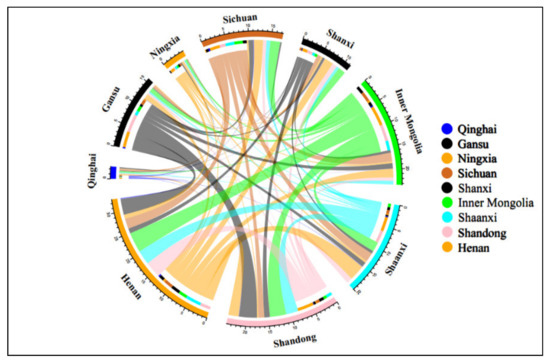 Virtual water trade between provinces in the upper reaches is not frequent, and the province with the largest trade flow is Sichuan Province, which is conducive to its good economic development. In the middle reaches, the trade volume of virtual water in Shanxi and Shaanxi Provinces is less than 70 million m3, so the trade exchange needs to be strengthened. The interprovincial virtual water-trade flow in the downstream region is large, which is conducive to the common economic development of Shandong and Henan Provinces. In addition to strong trade exchanges between the upper region of Sichuan and Inner Mongolia, as well as the midstream and the upstream, the virtual water-trade flow between other provinces in the upper reaches and the Shaanxi and Shanxi Provinces is small, which is inconducive to economic exchanges and development.