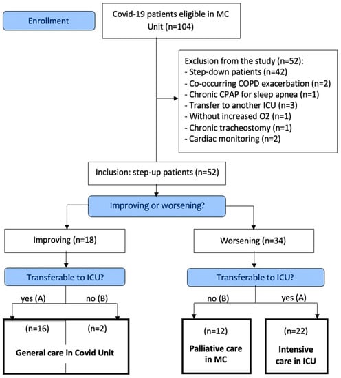 Inclusion criteria for the MC unit comprised a diagnosis of SARS-CoV-2 reverse-transcriptase polymerase chain reaction (rt-PCR)-confirmed COVID-19 complicated by respiratory distress. Respiratory distress was defined as follows: fractional inspired oxygen (FiO2) at 50% to maintain pulse oximetry (SpO2) above 92% saturation; and/or a respiratory rate above 30 cycles/min; increased work of breathing, defined as using accessory muscles and intercostal retraction; dyspnea, measured by visual analog scale; and suspicion of silent hypoxemia, the absence of dyspnea with severe hypoxemia. Only ‘step-up’ patients (defined as needing increasing care compared to those offered in COVID-19 wards) using high-flow oxygen therapy or CPAP were considered for study inclusion. Conversely, ‘step-down’ patients were transferred from the ICU to the MC unit (de-escalation of care: tracheostomy weaning, high-risk patient with ICU tetra paresis, etc.). The criteria for study exclusion are reported in the Consort flow diagram (Figure 1).