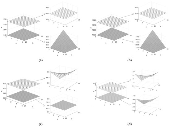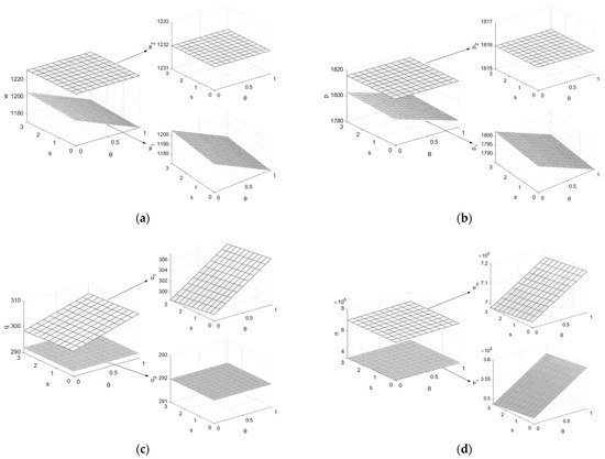 - Assuming , , , , , , , , , , letting and be the independent variables (, ), draw graphs of the variation of the decision variables and system members’ profits with and , as shown in Figure 5.