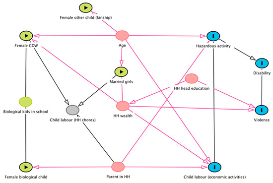 In the second stage of analysis, we used bivariable logistic regression to describe the frequency and distribution of the main exposure variables and each outcome variable (disability, hazardous work, any violence, child labour in economic activities). We did not include child labour in household chores as an outcome because hours in household chores was used to create the female CDW and other children’s categories. Next, we drew Directed Acyclic Graphs (DAGs) in DAGitty software [32] to map our conceptual assumptions and inform the selection of covariates in multivariable logistic regression models (Figure 1). DAGs were used to identify exposures for which we could estimate associations with the outcomes with minimal bias and thus include as covariates in statistical models [33]. The initial selection of covariates was based on literature regarding health outcomes and working conditions of CDWs, child brides, and children in kinship care. We selected covariates based on DAG recommended minimal adjustment sets, selecting the most parsimonious adjustment set [32]. As a result, eight separate multivariable analysis models representing each primary exposure were run to determine its effect on the outcome variables. Adjusted and unadjusted odds ratios (AOR and UOR) (with 95% confidence intervals (95% CI) were calculated using Stata Version 14 (Stata Corp, College Station, TX, USA).