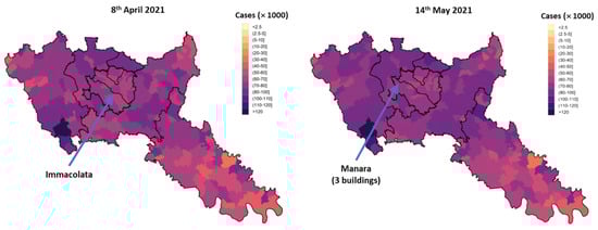The sampling campaign was held in spring 2021 (7 April 2021 at Immacolata and 13 May 2021 at Manara) when the city of Milan was registering a high number of confirmed COVID-19 infections. Figure 1 shows the locations of the schools on the map of infections on the periods when the sampling activities were carried out. Please note that the dates on the maps do not correspond exactly to the sampling dates because the maps were updated every two days.