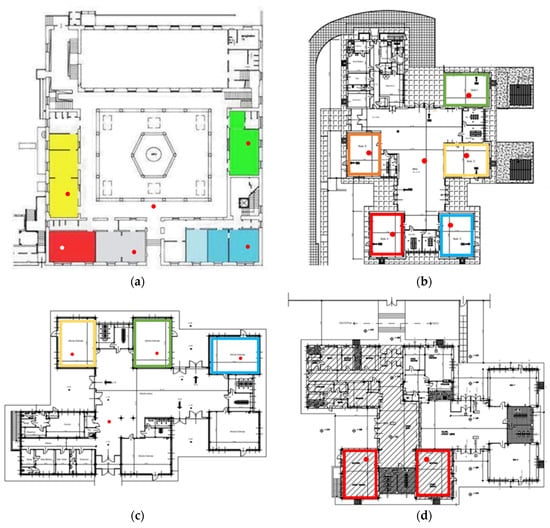 Figure 2. (a) Ground floor of Immacolata building; (b) Marx building; (c) Airaghi building; (d) Lamennais building.