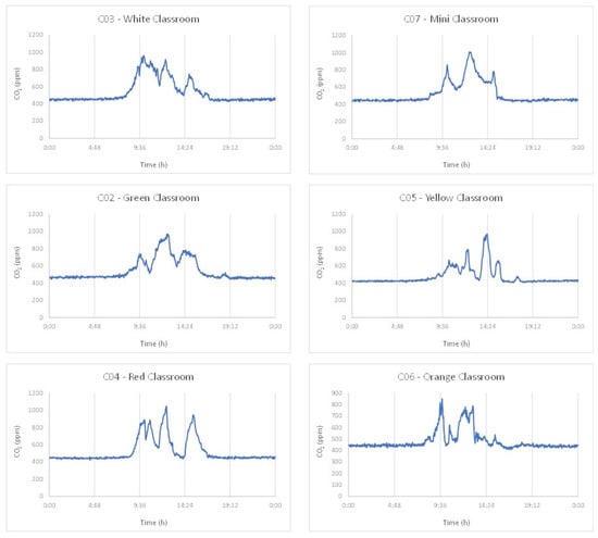 Operators took note of all the characteristics of ventilation and occupancy during the whole sampling. Air temperature, relative humidity, and CO2 concentrations were also collected. At Immacolata, the measures of these parameters in the classrooms and dining hall were performed with a set of Aranet4 Pro sensors coupled with an Aranet Pro base station, developed by SAF Tehnika J.S.C. (Riga, Latvia), integrated into a centralised data collection system developed by the eLUX Laboratory of the University of Brescia in the context of a former research project [77,78]. Moreover, in each classroom, a light indicator warns teachers for CO2 concentrations higher than 700 ppm and suggests opening the windows. For one of the classrooms, the data were not gathered due to a temporary unavailability of the sensors. The atrium was not monitored being only a passageway. At Manara, instead, the corresponding Aranet4 portable device was used for all the rooms.