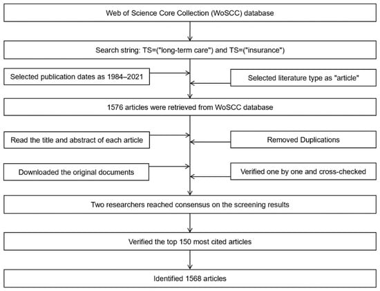 The data used in this article are from the Science Citation Index Expanded (SCI-E) and Social Sciences Citation Index (SSCI) in the Thomson Reuters Web of Science Core Collection (WoSCC) database, which is one of the world’s leading citation databases with multidisciplinary coverage of over 10,000 high-impact journals in the sciences, social sciences, and arts and humanities. The literature retrieval was carried out independently by 2 researchers simultaneously on 31 December 2021. The retrieval conditions were as follows: TS = (‘‘long-term care’’) and TS = (‘‘insurance’’). We performed a topic search of all publications that contained these words in title, abstract, and keywords. Meanwhile, the publication dates were set from 1984 to 2021 and literature type of article was chosen. After retrieving, the title and abstract of the obtained literature were read to determine whether they were relevant to the research topic, and eight repeated documents were removed. Then, the original texts of all the documents were downloaded, verified one by one and cross-checked. If there were differences and they were difficult to determine, the group members would study and discuss together, or the decision would be made by the third researcher. According to our retrieval results, the two researchers reached the same conclusion on the screening results, and the further validity test showed that the top 150 most cited articles were closely related to LTCI, indicating that our retrieval strategies and search terms were appropriate. The data collection process is shown in Figure 1. Finally, a total of 1568 literature results published between 1984 and 2021 were retrieved, each of which included the title, author, abstract, keywords, references, and other information.