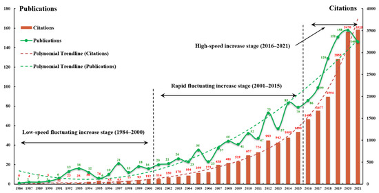 The annual number of publications and citations in LTCI field from 1984 to 2021.