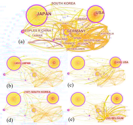 A visualization of the country collaboration network: (a) all countries/regions; (b) Japan; (c) USA; (d) South Korea; (e) Belgium.