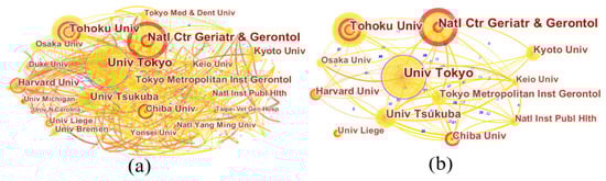 The institution map generated by CiteSpace kept the same parameters, except for the node type being changed from “country” to “institution”. The network consisting of 638 nodes and 870 links is depicted in Figure 4. As is shown, the most influential institutions focusing on LTCI are mainly from Japan. Table 2 lists the top 12 institutions with the greatest outputs in this area, with a contribution to 455 articles, accounting for 29.58% of the total. Within these 12 institutions, there were 10 Japanese institutions, once again indicating that Japan had significant LTCI research capabilities. Specifically, the University of Tokyo had the greatest number of publications, with a total of 78 papers, accounting for 5.07% of all publications. In second position was the National Center for Geriatrics and Gerontology with 64 publications (4.16%), followed by Tohoku University (64, 4.16%) and the University of Tsukuba (43, 2.80%). One prominent institution in the USA was Harvard University, with 31 publications (2.02%), which ranked fifth. Moreover, one European institution, the University of Liege (18, 1.17%), also made a significant contribution to this research.
