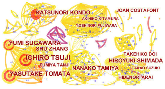 According to the collaboration networks of authors, it seems that the authors tended to collaborate with a single, highly productive author, thus forming co-author clusters. As shown in Figure 5, there are five main co-author clusters, with Tsuji, Kondo, Fujiwara, Tamiya, and Shimada as the central authors, respectively. For example, most of the authors in the Tsuji cluster were from Tohoku University, and they paid close attention to empirical research through the Ohsaki Cohort 2006 Study; the Kondo cluster used the Aichi Gerontological Evaluation Study to examine the influential factors of LTCI needs and costs; the Fujiwara cluster mainly conducted research on preventing frailty in the elderly; the Tamiya cluster had a common focus on the improvement of the LTCI system in Japan; the Shimada cluster applied a prospective cohort study to examine factors that increase the risk of disability in the elderly. However, all authors had low centrality (<0.1), revealing that the central authors did not occupy the position of “intermediaries”. The trend of LTCI development requires multi-dimensional cooperation across disciplines and institutions; hence, these authors could have the potential to become a “bridge” connecting institutional cooperation in the future, and strive to build a more dynamic and open cooperative network.