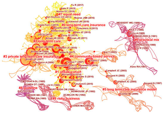 The second largest cluster (#1) contained 105 references and was labeled as the Ohsaki cohort. As mentioned above, Tsuji is a representative scholar of the Ohsaki cohort. Cohort study is a type of epidemiological study in which subjects are selected based on a common condition or exposure, and are then observed for a subsequent outcome [28]. There are seven highly cited references in this cluster. Among them, two references adopted this method to examine the factors associated with disability in the elderly defined by the certification of eligibility for LTCI, such as social participation [28] and dental health status [43]. Furthermore, five references focused on strategies for implementing LTCI: strengthening collaborations between medical care and LTC [44], improving LTCI certification [3,45], and providing LTCI services for dementia [9,38]. Moreover, the silhouette value of the cluster is 0.953, indicating high consistency among the cited articles in this cluster, with the article of Satake et al. [3] being cited most often, by 18 articles.
