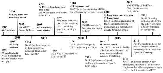 Cluster #2, long-term care, ranked third in cluster size, including 104 references that were mostly published around 2010. LTC is an integration of a health and social system in which families, professionals, carers, and volunteers provide services to older people in need of care to improve their quality of life. Recent evidence has shown that the fast-growing demand for LTC places heavy burdens on family carers [33]. To address this, the Japanese government initiated mandatory public LTCI in 2000 [2,29], while in the USA, the Community Living Assistance Services and Supports Act was enacted to help pay for LTC services and support for disabled Americans [46]. Additionally, Brown et al. [15] concluded that factors such as preferences and beliefs, substitutes for insurance, substitutes for formal care, and features of the private market affected the demand for LTCI, and the policy interventions designed to address only one factor are unlikely to dramatically increase the demand for LTCI.