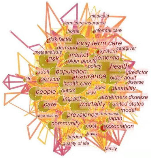 The top two keywords in terms of co-occurrence frequency were “insurance” (209) and “health” (198). Accordingly, the health status of the elderly is a hot topic in LTCI research. It is noteworthy that keywords such as “long-term care”, “mortality”, “risk”, “care”, and “health” have both high frequency and citation bursts. It is consistent with the fact that more efforts are devoted to these research themes which are pivotal in developing LTCI.