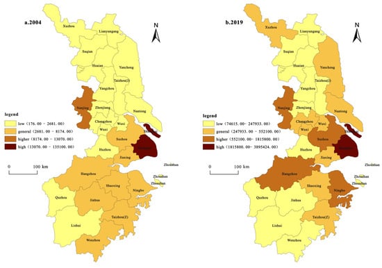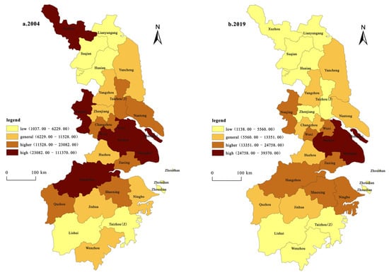 - Spatial patterns based on innovation inputs (Figure 2). The innovation input is represented by scientific and technological expenditure, and the classification and mapping were carried out using the classification method of natural breaking points in the ArcGIS software. The spatial pattern of innovation investment in the YRD has a prominent single-center structure and exhibits a trend of diffusion. In 2004, Shanghai was the only city with a “high” investment in innovation, accounting for 62.9% of the total investment in the YRD. Nanjing city had the highest investment. Suzhou, Jiaxing, Hangzhou, Jinhua, Shaoxing, Ningbo, Taizhou, and Wenzhou were categorized as “general”, while the rest were categorized as “low”. In 2019, only Shanghai was categorized as “high”, while Suzhou, Hangzhou, and Taizhou were raised in rank to the “high” category. Jinhua and Wenzhou were categorized under “general”, Wuxi, Changzhou, Xuzhou, Yancheng, and Nantong were raised in rank to the “general” category, and the other cities remained unchanged.