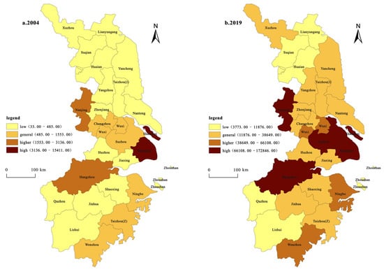 - Spatial patterns based on innovation output (Figure 3). The innovation output is represented by the number of patent authorizations, and the classification and mapping were carried out using the natural breaking point classification method in the ArcGIS software. The spatial distribution of the innovation input was found to be moderately consistent with that of the innovation output. In 2004, Shanghai was the only city with a “high” innovation output, while Nanjing and Hangzhou were the two cities with high innovation output. Six cities were categorized as “general”: Changzhou, Suzhou, Wuxi, Ningbo, Taizhou, and Wenzhou, accounting for approximately 1/4, and the rest were categorized as “low”. In 2019, four cities were categorized as “high”, with Shanghai remaining in the “high” category, while Nanjing, Suzhou, and Hangzhou cities were raised in rank to the “high” category. The number of cities in the “high” category increased to three. The cities of Wuxi, Ningbo, and Wenzhou increased from 6 to 12, accounting for almost 1/2. Changzhou and Taizhou were always categorized as “general”. Xuzhou, Nantong, Yancheng, Yangzhou, Zhenjiang, Taizhou, Jiaxing, Huzhou, Shaoxing, and Jinhua increased from the “low” to the “general” type, while the rest of the cities still belonged to the “low” category. Generally, there are three core spatial distribution patterns: those of Hangzhou, Shanghai, and Nanjing. The innovation output capacity of most prefectures and cities has obviously improved; the number of innovation outputs has increased, and differentiation has been enhanced.