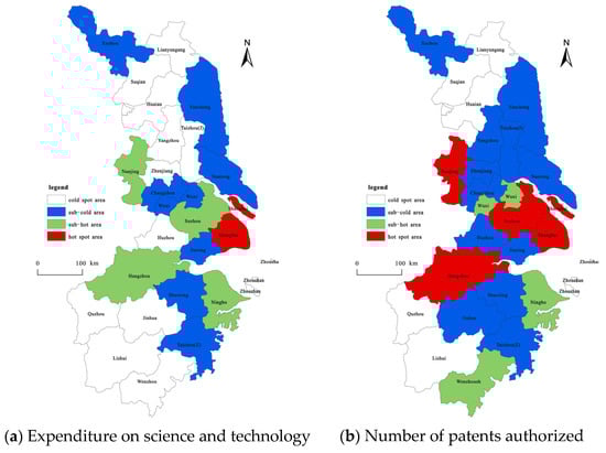 The increase in Shanghai’s innovation investment based on science and technology expenditure accounts for 27.08% of the total increase in innovation investment in the YRD. Based on the number of patents granted, the increments in the innovation output of the cities of Nanjing, Suzhou, Shanghai, and Hangzhou account for 9.59%, 11.72%, 15.06%, and 9.62%, respectively, of the total increase in the innovation output of the YRD, which is 45.99% in total. This is basically attributed to the aforementioned mechanism of the spatial agglomeration hotspot of the growth of innovation in the YRD based on science and technology expenditure and patent number. Based on the growth of innovation investment (calculated using scientific and technological expenditures) in the YRD between 2004 and 2019, the proportion of hotspots, secondary hotspots, secondary cold spots, and cold spots were calculated as 4%, 16%, 32%, and 48%, respectively. The hotspots of innovation investment growth show a spatial distribution with Shanghai as the single core, while the sub-hot and sub-cold areas are mainly distributed in a “Z” type of distribution belt centered on Shanghai hotspots. This shows that the cities in the sub-hot and sub-cold spots are influenced by the space radiation of the cities in the hotspots and have positive interactions. The sub-cold zone is also sporadically distributed, such as Xuzhou in the north of Jiangsu and Taizhou in the southeast of Zhejiang. The cold regions are agglomerated and are mainly distributed in the central and northern part of Jiangsu and the western and southern parts of Zhejiang, while the cold spots indicate that the development potential of innovation investment agglomeration based on science and technology expenditure is low. Based on the growth of innovation output (which was calculated using the number of patents granted) in the YRD region between 2004 and 2019, the proportion of hotspots, secondary hotspots, secondary cold spots, and cold spots were calculated to be 16%, 12%, 48%, and 24%, respectively. The spatial distribution of the hot areas of innovation output growth in the YRD has three core distributions: Shanghai and Suzhou, Nanjing, and Hangzhou; additionally, the radiation ability of Shanghai was enhanced. There are only three sub-hotspots: Wuxi, Ningbo, and Wenzhou. The distribution of the sub-cold zone is relatively concentrated, mainly around the hot zone. The number of cold regions is small, and they are clustered, mainly distributed in Lianyungang, Suqian, and Huaian in northern Jiangsu, and in Quzhou, Lishui, and Zhoushan in southwestern Zhejiang.