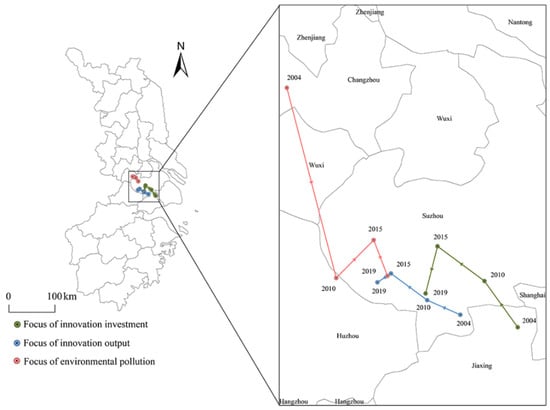 More specifically, the centers of gravity of innovation output, innovation input, and water pollution in the YRD were in Jiaxing-Suzhou-Suzhou-Suzhou, Suzhou-Suzhou-Suzhou-Suzhou, and Changzhou-Huzhou-Suzhou-Suzhou, but before 2015, the focus of innovation output, innovation input, and the change trajectory of water pollution were basically the opposite. After 2015, the trajectory of the center of gravity of the three began to have a certain similarity (Figure 6).