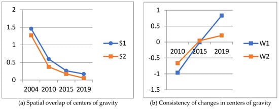 Note: S1 represents the spatial overlap between the centers of gravity of input-based innovation and patent-based innovation output, and S2 represents that of environmental pollution. W1 and W2 represent the consistency of changes in the center of gravity of these two types of innovation and the center of gravity of environmental pollution, respectively. The vertical axis of Figure 7a,b shows the consistency of the spatial overlap and change between the two types of technological innovation and the water pollution center of gravity, respectively. The horizontal axes of Figure 7a,b are both years.