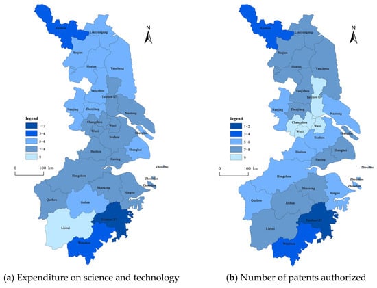 From 2004 to 2019, the growth of innovation output in the YRD based on the number of patents granted in the hotspot area and the sub-cold spot area increased compared to the growth of innovation input based on science and technology expenditure. This indicates that an increasing number of cities in the YRD pay more attention to the important role of innovation in regional development, which is consistent with the regional integration development strategy and innovation-driven development strategy of the Changjiang Delta. At the same time, Shanghai is a hotspot in terms of innovation input and output, which shows high innovation investment and output activity in Shanghai and a significant high concentration pattern. Shanghai plays a key role in driving innovation in neighboring cities, which is closely associated with Shanghai’s superior geographical location, highly developed economy, and national policy support. Lianyungang, Suqian, and Huaian in Jiangsu Province along with Quzhou, Lishui, and Zhoushan in Zhejiang Province are categorized as cold spots in terms of innovation input and output. The level of urban economic development in these peripheral regions has been observed to be relatively low, and the degree of innovation input and output concentration is weak. Therefore, there is still a lot of room for improvement in the future.