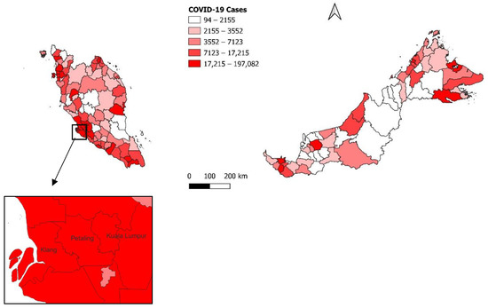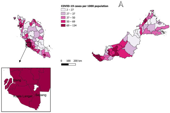 For the overall time period, the highest number of cases were distributed in Petaling (n = 197,082 cases), followed by Kuala Lumpur (n = 178,406 cases) and Klang (n = 126,579 cases), as shown in Figure 1. The highest COVID-19 incidence rate was reported in Sepang (133.8 per 1000 population), followed by Klang (119.8 per 1000 population) and Kuala Langat (115.2 per 1000 population), as shown in Figure 2.