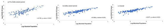 Correlation between absolute population and COVID-19 cases, (a) Pre-Delta variant period, (b) Delta variant period, (c) Overall period.