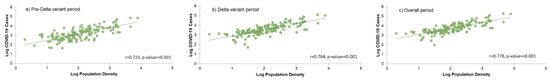 Correlation between population density and COVID-19 cases, (a) Pre-Delta variant period, (b) Delta variant period, (c) Overall period.