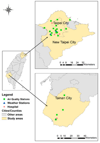 The hourly AQI was also assessed, which was determined based on the maximum subindex value among the concentrations of the following air pollutants: PM2.5, PM10, O3, SO2, CO, and NO2 [35]. The AQI ranges from 0 to 500, with a higher score indicating poorer air quality. The AQI values were divided into three groups according to the Environmental Protection Administration regulations: good (0–50), moderate (51–100), and unhealthy (>100) [36].