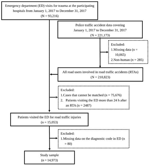 Data were retrospectively collected from the electronic medical records of patients with RTIs treated at the aforementioned trauma centers between 1 January 2017 and 31 December 2017. The patients’ national identification numbers were used to connect the collected data to the police traffic accident dataset (PTAD) in order to identify patients whose RTIs were treated in the emergency department (ED) and obtain information regarding the RTAs in which they were involved. The identification numbers were deleted upon connection. To further ensure that RTAs and ED visits were causally related, we only included patients admitted in the ED within 24 h after an RTA. For each patient who visited the ED several times after sustaining an RTI, only the records of the initial visit were included. The patient selection process is illustrated in Figure 2.