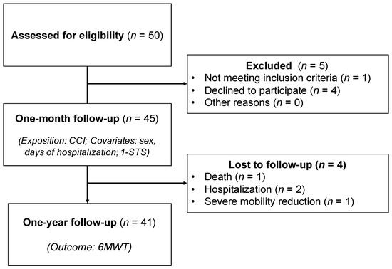 We conducted statistical analyses through Stata version 16.1 (StataCorp, Texas, TX, USA). The Shapiro test served to check normality. Associations between CCI (exhibition) and meters covered in the 6MWT (outcome) were assessed through crude and adjusted linear regressions. Due to the low number of individuals, we created a propensity score index that accounted for potential confounders, such as sex, days of hospitalization due to COVID-19, and previous functional capacity (i.e., 1-STS one-month after discharge), for model adjustment. We checked the final model using additional variables without improving the accuracy of the obtained estimations. Estimations are provided as beta coefficients and 95% confidence intervals (CI). Finally, we created a scatterplot showing the data distribution of the two examined variables with a regression line and a shadowed 95% CI. Differences over time for 1-STS were evaluated using the Wilcoxon test or paired t-test according to the distribution of the data. Levels of significance were set at p < 0.05. Post hoc power (1-β err prob) was calculated with the G*Power 3.1 program, version 3.1.9.2 (Universität Düsseldorf, Düsseldorf, Germany), using the linear multiple regression statistical test (single regression coefficient). Input data were: one-tailed; effect size f2 = 0.59; α err prob = 0.05; total sample = 41; and number of predictors = 1.