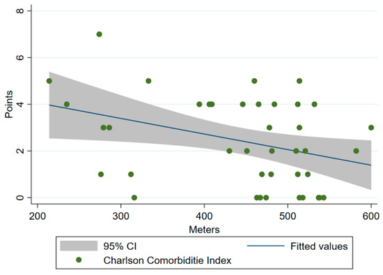 A significant association was observed between CCI and distance covered (meters) in the 6MWT one year after hospitalization for COVID-19: (i) crude model: R2 = 0.1022, β = −18.7, 95% CI = −34.7 to −2.6, p < 0.05; (ii) adjusted model: R2 = 0.3286, β = −23.0, 95% CI = −39.1 to −6.8, p < 0.05 (Table S1). Figure 2 shows the scatter plot with the regression line for the crude association between CCI and 6MWT. Fifty-two percent of COVID-19 survivors had a CCI score ≥ 3 (high comorbidity burden). The post hoc power (1-β err prob) of association between the CCI and the 6MWT was 99%. Finally, a significant increase in the 1-STS of 3.5 repetitions was observed during follow-up (p < 0.05). However, 1-year after discharge, 85% of participants were below the 25th percentile, relative to baseline values [22].