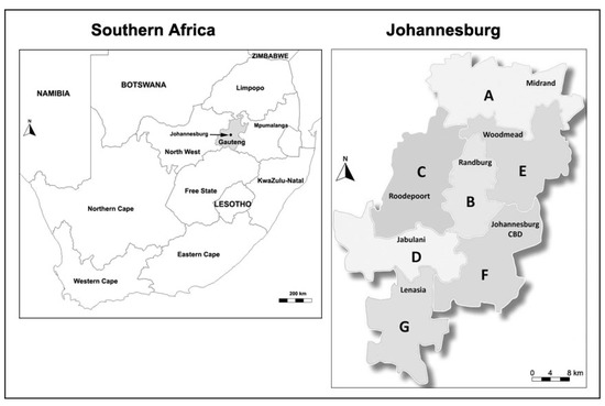 Geographical location of Johannesburg and the different regions of this city. (A = Region A; B = Region B; C = Region C; D = Region D; E = Region E; F = Region F; and G = Region G).