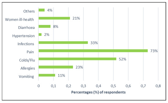 In terms of awareness about HPWs, 77% (n = 286) of respondents claimed to have some knowledge of such waste materials, while 23% were not aware. Therefore, investigating the different types of medicines kept at home is important as far as their contribution to the generation of HPWs is concerned. In Figure 2, the proportions of respondents who mentioned specific types of medicines used and kept in their homes are indicated. Most respondents mentioned the use of painkillers or analgesics (73%, n = 270) to reduce bodily pain and medicines applied to treat colds and flu-related illnesses (52%; n = 193). Another important class of medicines was anti-allergic drugs (23%, n = 85), medications for women’s health (21%, n = 75), and antibiotics (33%, n = 122) for treating various types of infections. These findings bear some similarities with some previous studies. For example, analgesics were the most frequently (46%, n = 115) reported medicines amongst households in Mauritius [34] as well as in the community cross-sectional survey (29%, n = 149) conducted in the Tigray Region of Northern Ethiopia [35]. Similarly, in Cape Town (South Africa), about 64% (n = 104) of respondents reported painkillers as part of unused medicines in their homes [36]. Another commonly reported group of household drugs are antibiotics, which were documented in various studies, thus denoting their prevalence in many households [35,37,38].