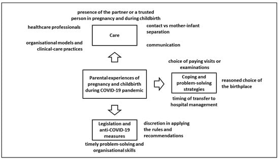 With regard to care, five sub-themes emerged: organisational models and clinical-care practices, healthcare professionals, presence of the partner or trusted person during pregnancy and during childbirth, continued contact vs. mother–infant separation, and communication.