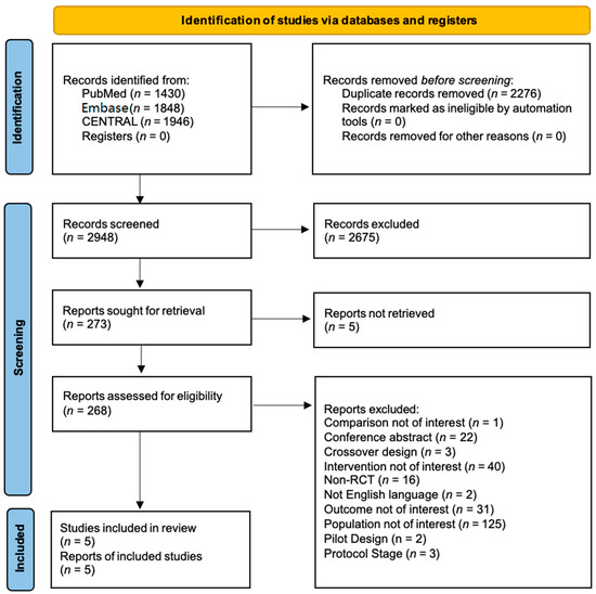 The search identified 2948 titles and abstracts, excluding duplicates. No additional records were obtained from other sources. Of 268 full-text articles assessed for eligibility, 5 studies met the inclusion criteria to address the study question [26,27,28,29,30], as shown in the PRISMA flow diagram in Figure 1.