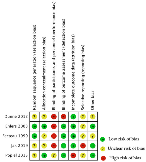 Blinding of outcome assessors (the participants) was not attainable in any of the five RCTs [27,28,29,30,31]. Reasons for this rating include the use of self-reporting instruments to measure the primary outcomes [27,28], the comparison of the intervention group against a waitlist [30,31], no intervention (repeated assessments) [29], or conventional therapy [28] group. Hence, all studies were judged as high risk of bias.