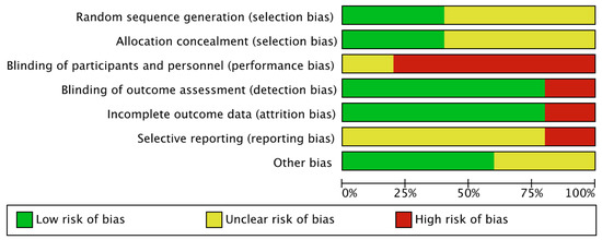- Higgins, J.P.T.; Altman, D.G.; Gøtzsche, P.C.; Jüni, P.; Moher, D.; Oxman, A.D.; Savović, J.; Schulz, K.F.; Weeks, L.; Sterne, J.A.C. The Cochrane Collaboration’s tool for assessing risk of bias in randomised trials. BMJ 2011, 343, d5928. [Google Scholar] [CrossRef] [Green Version]