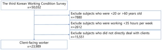 In the present study, from the 50,032 individuals enrolled in the third wave of the KWCS, we obtained data for those aged 20 to 60 years old and working at least 35 h weekly. To identify potentially exposed workers, we used the statement: “I directly manage those who are not business partners, such as customers, passengers, students, or patients”. (Henceforth, we refer to these four groups together as “clients”). The seven response options were: always, almost always, 75% of the time, 50% of the time, 25% of the time, almost never, and never. We excluded workers who managed clients “almost never” or “never”. In total, 48% of all respondents (n = 23,989) were included in the study (Figure 1). Of note, 53% of those who reported attending to clients in their jobs were in occupational categories outside the “sales” and “service” classifications.