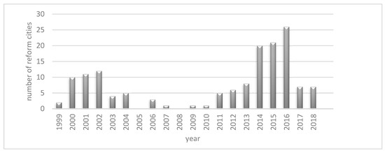 In the 70 years since the founding of the PRC, the main administrative means of reorganizing China’s administrative divisions have included the abolition of counties and the establishment of districts and cities. Counties-to-cities reforms had been suspended due to inefficiency (1997~2016), and the list of cities approved by the Ministry of Civil Affairs for removal of counties to establish cities in the past three years is basically dominated by small and medium-sized cities in Central and Western China, whereas county-to-district reform has become an important means to promote the development process of urbanization in China. China’s county-to-district reform began in the 1980s and has developed rapidly. As of December 2018, China has seen municipalities directly under the central government (Beijing, Shanghai, Tianjin) and prefecture-level cities (Wuhan, Nanjing, Guangzhou, Shenzhen, Xiamen, Zhuhai, Zhongshan, Dongguan, Foshan) presenting urban characteristics without counties. China has seen 181 reforms of county abolition (1999~2018), including 104 reformed cities, which are widely distributed in major cities in East, Central and West China. Eastern cities and provincial capitals are hotspots for reform. Since factors such as economy, population and land area are important indicators for the State Council to approve whether a city can pass the reform, the county-to-district reform is non-random in nature. As shown inFigure 1, in terms of time distribution, 2000–2004 and after 2010 are the boom periods of county-to-district reforms. In the future, China has a strong preference for local governments to county-to-district reforms in the context of the key development of urban clusters and metropolitan areas. County-to-district reforms effectively break the border effect between counties and cities and the dual structure of urban–rural division and promote the integrated construction and development of cities. In March 2022, China’s State Council issued “the Opinions on Accelerating the Construction of a Unified National Market”, and county-to-district reform, as an effective policy tool for the government to promote the construction of regional integration, has provided policy support to facilitate the flow of resource factors (land, human resources, capital, information, etc.).