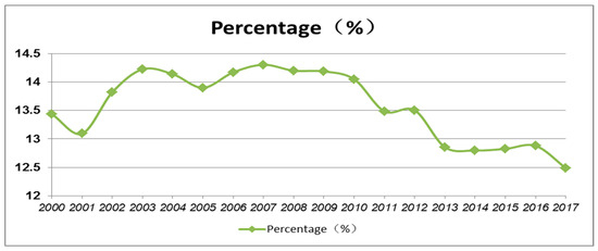 Carbon Emissions of Yangtze River Delta Urban Agglomerations as a Percentage of China’s Carbon Emissions, 2000–2017. Data source: Calculated based on the county’s annual carbon emissions.