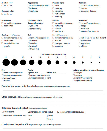 | Eyes Pupil size Pupil reaction to light | Orientation Response Mood/Behavior | Getting out of the car Gait Physical signs Reaction Speech | Alcohol odor Cannabis odor Appearance Command of the German language |