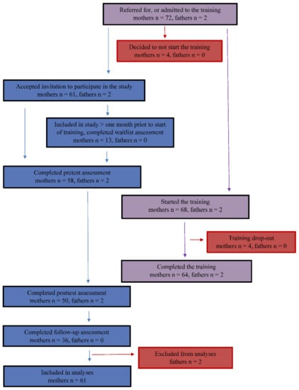 The data for this study was derived from an ongoing study, which focuses on the comparison of Mindful with Your Baby in a clinical and preventive setting. The current study was approved by the Ethics Committee of the University of Amsterdam (2017-CDE-7946). Written informed consent was obtained from all participants. All measurement occasions consisted of questionnaires that could be filled in online. Only mothers who were referred or admitted to the training at least one month prior to the start of the training (and who thus had to wait at least one month for the training to start), were invited to complete a waitlist assessment, to control for factors such as time, participation in research, and hope for change. Thirteen (21.3%) participants completed waitlist assessment (average waiting time between the completion of the waitlist assessment and the start of the training was 45.9 days, SD = 13.5, range 19–67 days). The pretest was administered one week prior to the start of the training and was completed by 58 (95.1%) of the mothers. The posttest was administered immediately after the training and was completed by 50 (82.0%) of the mothers. Lastly, the mothers received the follow-up assessment eight weeks after the training, and this assessment occasion was completed by 36 (59.0%) of the mothers. Some of the mothers also participated in additional research activities, namely parent–child observations and/or daily measurements, but these additional measures were not included in the current study. A flow diagram of participation in the study can be found in Figure 2.
