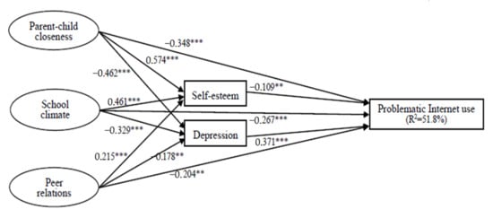 This study aims to investigate the effects of school climate, parent–child closeness, and peer relations on adolescents’ problematic Internet use. The results show that school climate, parent–child closeness, and peer relations have significant direct effects on adolescents’ problematic Internet use, and this influencing path is mediated through self-esteem and depression. All hypotheses are verified in this study.