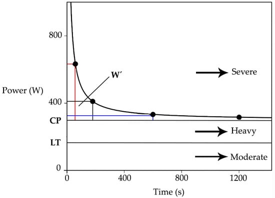 W’ is constant, but may be utilized at different rates depending on the proximity of the exercise PO to the CP [5]. W’ is measured in kilojoules (kJ) and is a function of the oxygen uptake (VO2) slow component; meaning a slow increase in the VO2 during constant work performed above the lactate threshold [6]; maximal oxygen uptake (VO2max); the depletion of intramuscular substrates, such as muscle creatine phosphate; and the glycogen, and the accumulation of metabolites (hydrogen ions, adenosine diphosphate, phosphate ions), which is associated with impaired muscle contractile function [7]. The CP represents an important parameter of an aerobic function. It can provide an even more meaningful criterion based on the measure of external PO and time than the lactate threshold or the maximal uptake of oxygen (O2) [3,8]. Rather than using equivalent exercise intensities relative to these metabolic parameters (lactate threshold, VO2max), setting exercise intensity relative to CP combines systemic and intramuscular response, and the W’ is expended above the CP, VO2max is attained, and intolerance is manifested. The CP occurs approximately at 70–80% VO2max and trained individuals can reach 80–90% VO2max [4].