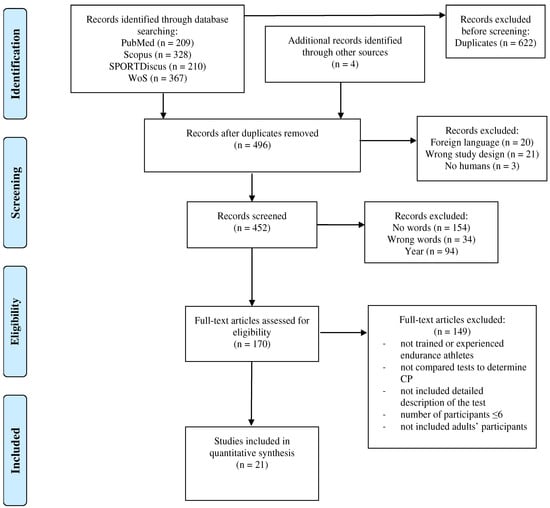 A literature search was conducted in four databases: PubMed, Scopus, SPORTDiscus, and Web of Science. The keywords put into the search were: (“critical power”) AND (“test” OR “tests” OR “method” OR “methods”) AND (“bicycle ergometer” OR “cycle” OR “cycling”). This review followed the PRISMA flow diagram (Figure 2). Several records (n = 4) were added from the literature search found in the relevant articles.
