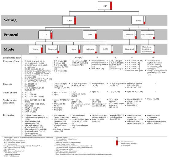 The advantage of CP testing is that it gives you two physiological markers from one test (CP and W’). Knowing both the CP and W’ can be useful in determining how to balance these different parts of the physiology, similarly to how the lactate threshold is a balance between the aerobic and anaerobic systems [5]. Due to the different approaches to testing methods, it is a difficult task to determine which testing protocol is the most suitable. There is a large diversity of methods and many criteria can be chosen to establish the testing protocol. This review searched the more recent scientific literature from the years 2012–2022 to provide a comprehensive overview of testing protocols. The aim of this paper is to evaluate all possible tests on bicycle ergometers and their alternatives in order to determine CP among endurance athletes and compare them. This could simplify decisions relating to test selection and provide a compact overview of all possible criteria that affect testing.